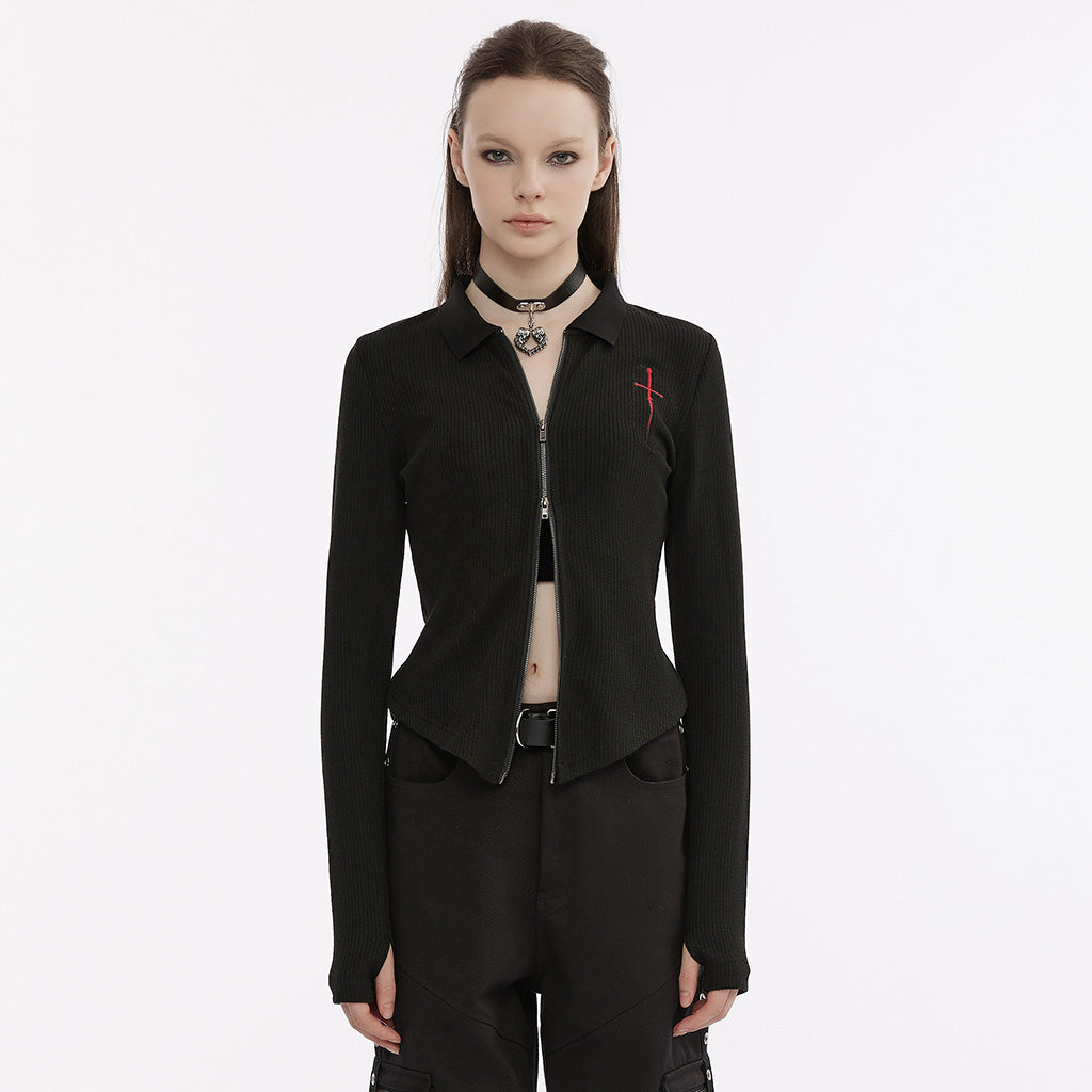 Embrace the fusion of gothic elegance and punk energy with this essential zip-up top, making every outfit effortlessly striking.