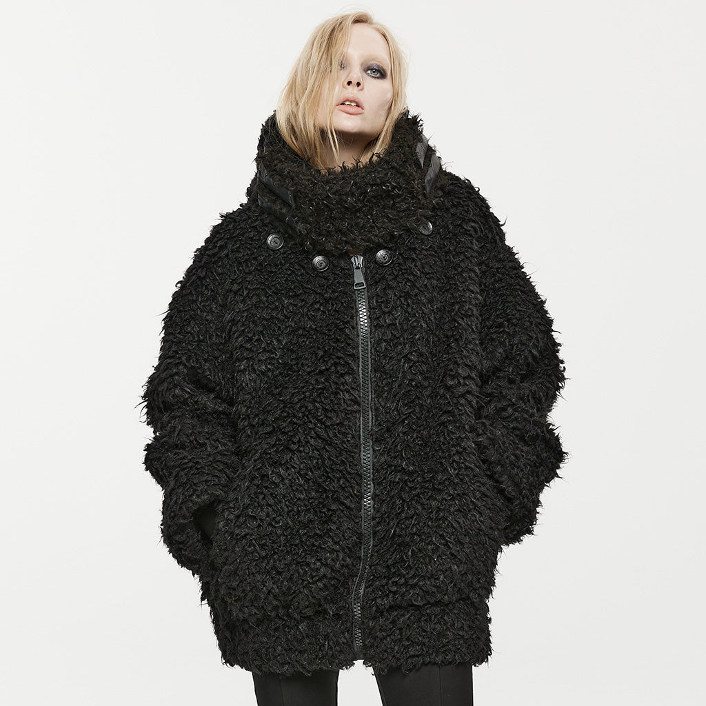 Introducing the Punk Coat Oversized Furry Black Jacket, a bold statement piece that combines comfort and edgy style. This jacket features a high collar and zippered style, perfect for those who embrace a rebellious flair with a touch of coziness. Make a statement on the streets with this standout piece that enhances any outfit with its striking design.