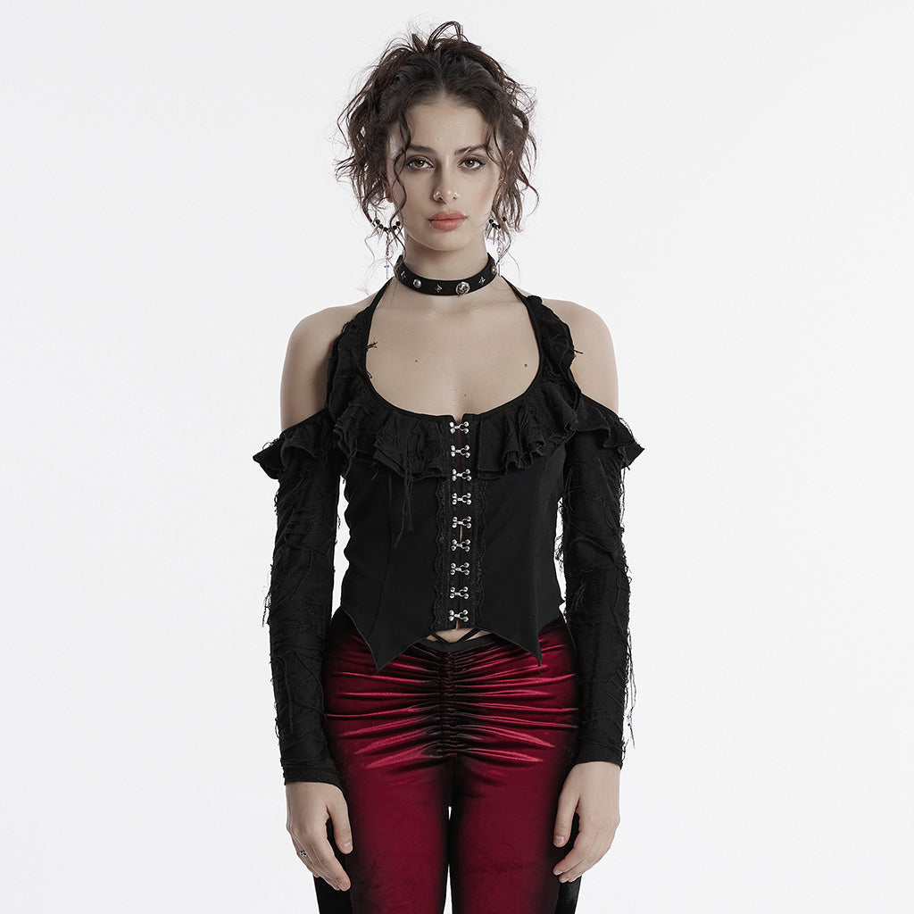 Embrace the timeless allure of gothic fashion with this captivating cold shoulder top, where romance meets rebellious style.