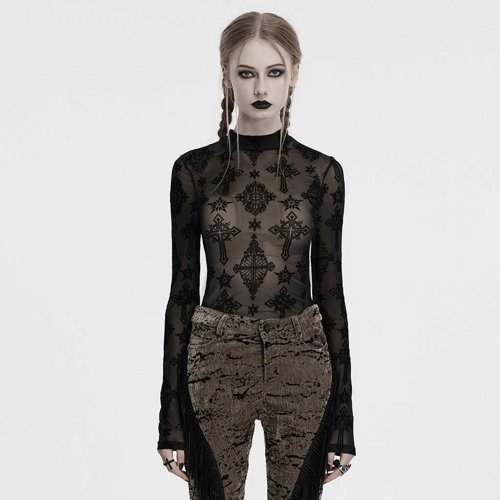 Introducing the Gothic Shirts Sheer Black Cross Embroidered Long Sleeve Top, a captivating addition to your wardrobe that fuses ethereal elegance with gothic charm. Designed for those who embrace the mysterious and the beautiful, this top is perfect for making a striking impression. The intricate cross embroidery and sheer fabric offer a distinctive look that’s both daring and sophisticated.
