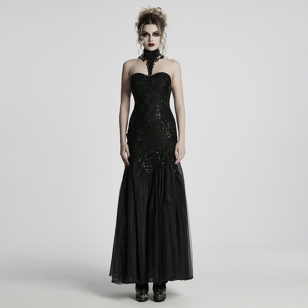 Introducing the Elegant Black Lace Gothic Dress, a stunning floor-length gown that effortlessly marries classic gothic sensibilities with contemporary elegance. This strapless masterpiece is designed for those who desire a blend of sophistication and drama, capturing attention with its intricate lace detailing. Whether you’re attending a formal event or embracing your gothic style, this dress is your ideal choice for an unforgettable look.