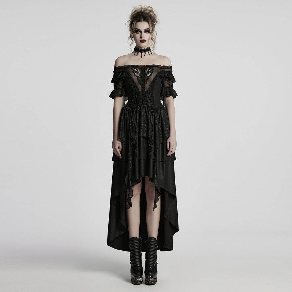 Introducing the Gothic Dress Off Shoulder Lace Asymmetric Hem Steampunk Style, an exquisite blend of gothic allure and steampunk flair. This dress is perfect for those who embrace the mysterious elegance of alternative fashion. With its off-shoulder design and intricate lace detailing, it adds a touch of dark romance to any wardrobe. Whether you're attending a themed event or want to make a bold statement, this dress is your ultimate choice for an unforgettable look.