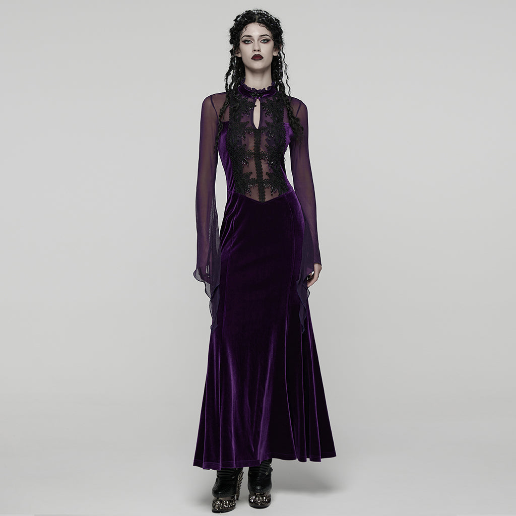 Introducing the Velvet Gothic Dress with Sheer Sleeves and Lace Detailing, a captivating blend of opulent gothic elegance and modern style. This dress is perfect for those who wish to make a statement with its luxurious velvet fabric and intricate lace accents. Whether you're attending a gothic gala or adding a dramatic piece to your wardrobe, this dress offers an enchanting allure.