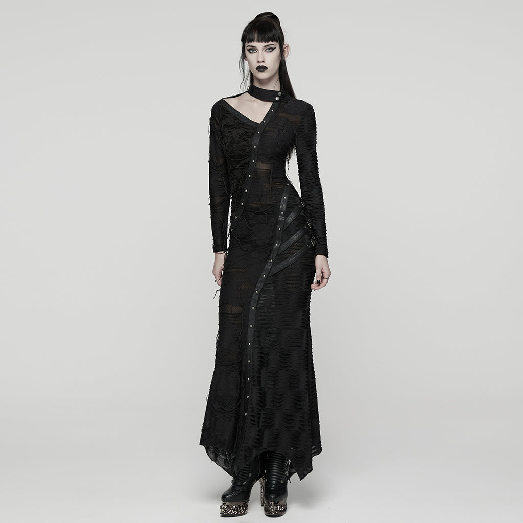 Introducing the Elegant Gothic Dress with Asymmetrical Sheer Panels, a stunning blend of mystique and modern gothic elegance. This long sleeve maxi dress is perfect for those who desire a dramatic and sophisticated silhouette. Its unique design is crafted to make a statement, with flowing lines and sheer textures that capture the essence of gothic allure.