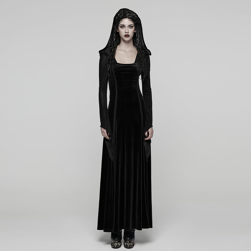 Introducing the Elegant Velvet Hooded Gothic Dress, a luxurious blend of elegance and dark allure. This floor-length black gown is crafted for those who embrace the beauty of the gothic aesthetic, featuring a dramatic hood and rich velvet fabric that make it a definitive statement piece. Whether you're attending a special event or expressing your unique style, this dress offers unparalleled sophistication and gothic charm.