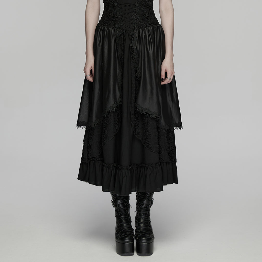 Introducing the Dark Gothic Dress Layered Lace Corset Skirt Long Hem, an exquisite blend of gothic allure and timeless elegance. This Gothic Dress is designed for those who appreciate intricately detailed fashion with a dark, romantic edge. The cascading lace layers and corset detailing make this dress a statement piece that embodies both mystery and sophistication.
