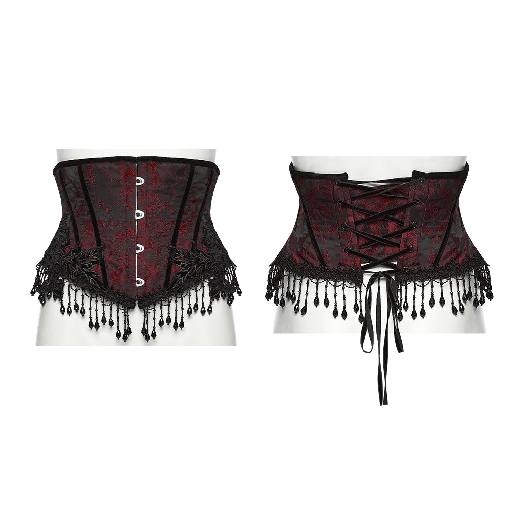 Introducing the Gothic Corset Lace-Up Red Jacquard Beaded Steampunk Waist Trainer, a mesmerizing blend of vintage steampunk charm and gothic elegance. This corset is crafted for those who embrace a bold, Victorian-inspired look, with intricate beading and a striking red jacquard pattern that captivates onlookers. Whether you're attending a gothic event or enhancing your wardrobe, this waist trainer is your ultimate choice for refined boldness.