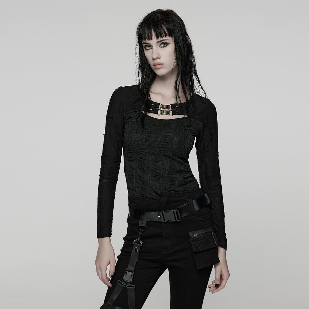 Introducing the Gothic Buckle Strap Black Long Sleeve Punk T-Shirt, a striking blend of bold punk style and gothic elegance. This shirt is crafted for those who seek a daring and avant-garde aesthetic, featuring unique buckle straps and intricate pleats that make a powerful fashion statement. Whether you're out on the town or looking to elevate your everyday wardrobe, this piece delivers an unmistakably edgy look.