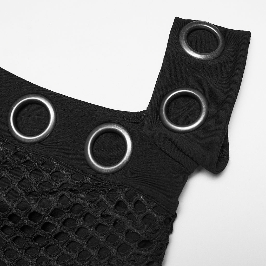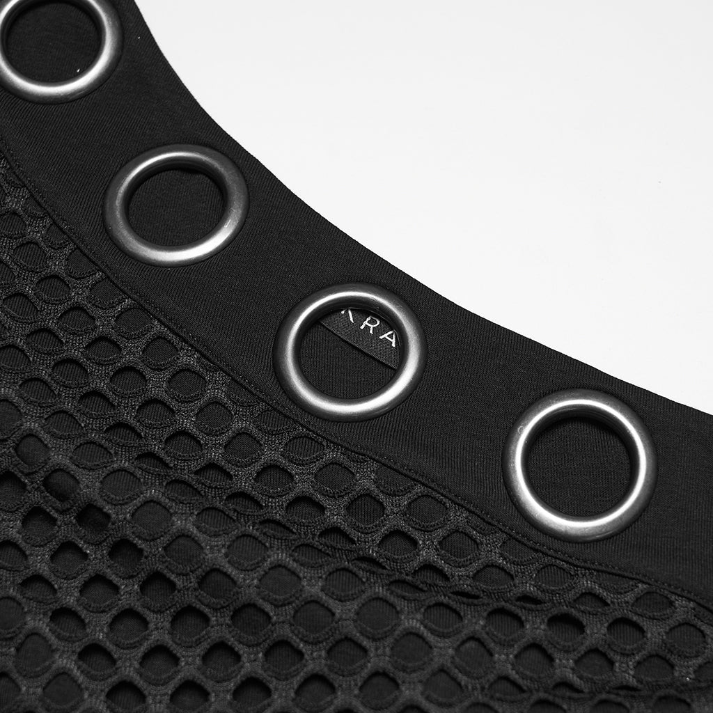 Introducing the Edgy Asymmetrical Fishnet Punk Shirt with Grommet Detail, a daring addition to any alternative wardrobe. This black top merges provocative design with punk flair, featuring striking asymmetrical cuts and intricate grommet embellishments. Perfect for those who seek to express their unique style with confidence and attitude.