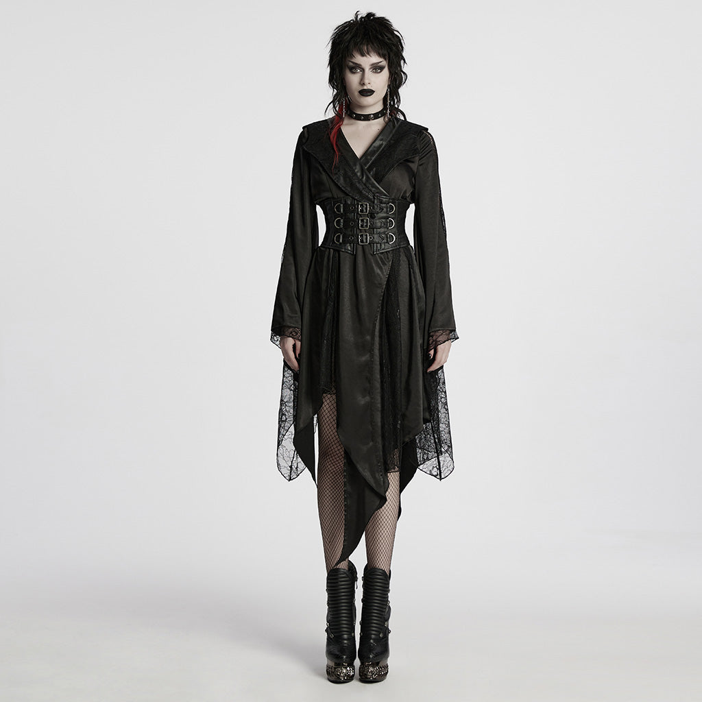 Introducing the Gothic Coat with Asymmetrical Hem and Lace Buckle Detail, a masterpiece of dark elegance and avant-garde design. This coat is for those who embrace their mysterious side, combining intricate lace details with an edgy asymmetrical cut. Whether you're striving for a sophisticated gothic look or an eye-catching ensemble, this coat promises a striking presence.