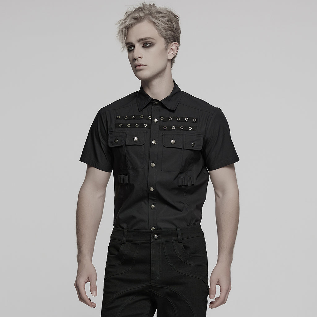 Introducing the Edgy Black Short Sleeve Grommet Punk Shirts for Men, where classic punk rebellion meets modern style. This shirt is crafted for those who desire an assertive, self-assured look. Its striking grommet detailing and sharp tailoring make it the ideal statement piece for any punk-inspired ensemble.
