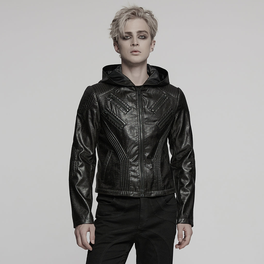 Introducing the Mens Gothic Hooded Zipper Punk Jacket in Black Leather Style, a striking synthesis of gothic elegance and punk rebellion. This jacket is curated for those who dare to defy conventions with its commanding presence and intricate details. Ideal for making a bold fashion statement, this piece is your ticket to an elevated punk look.