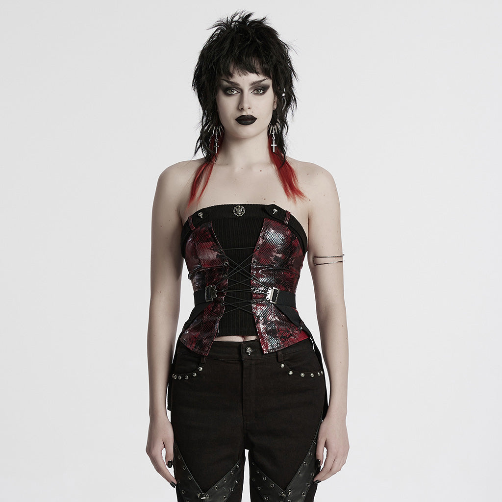 Introducing the Edgy Punk Corset with Red Snakeskin Look and Buckle Straps, a bold statement piece infusing fierce punk attitude with a touch of luxurious detail. Perfect for fashion-forward rebels, this corset brings together an eye-catching snakeskin print and contemporary buckle accents, making it an essential addition to any daring wardrobe.