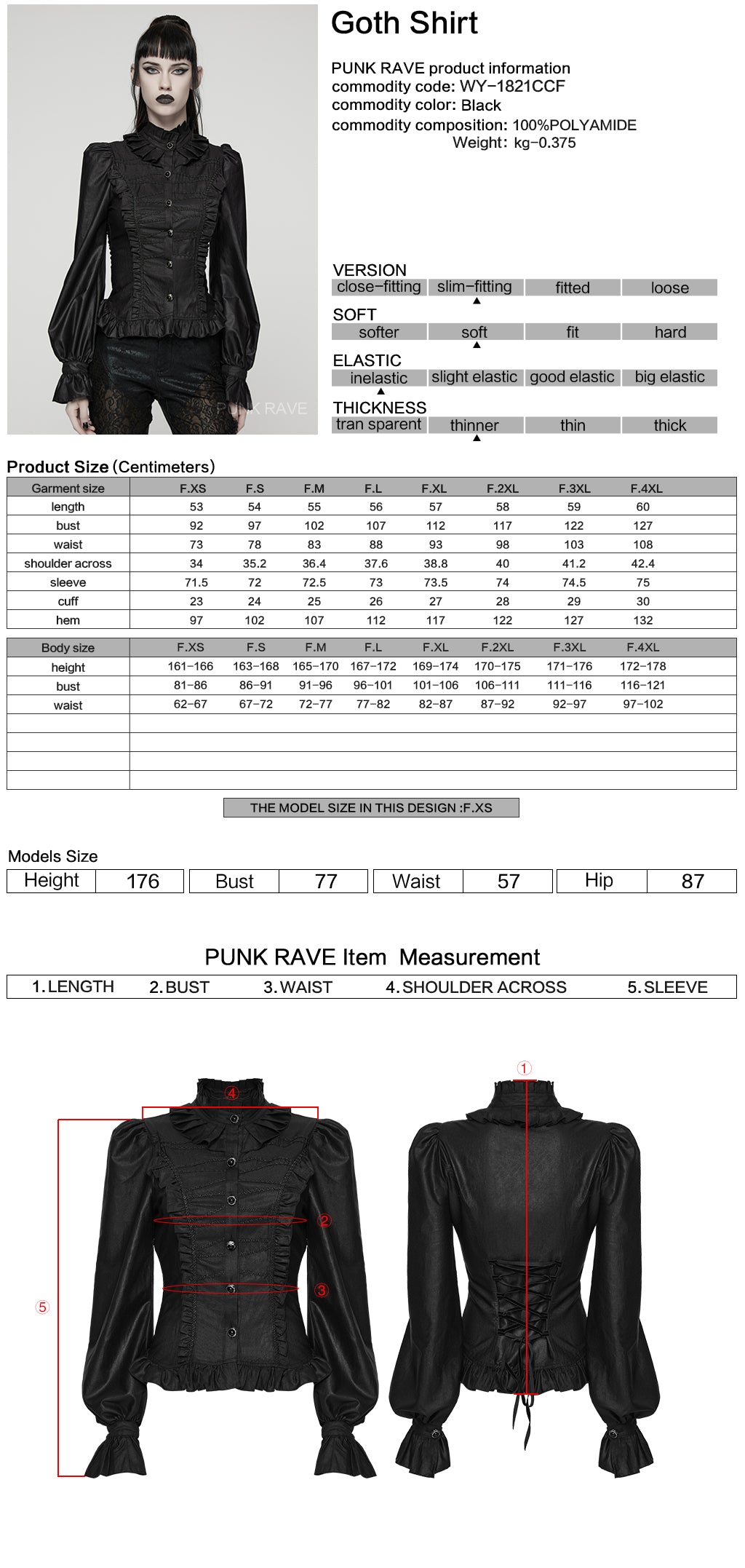 Fit and Feel: Crafted with a close fit, this blouse contours beautifully while offering enough structure for graceful movement. The rich fabric provides an elegant touch against the skin, made to enhance your gothic wardrobe with a touch of Victorian sophistication.
