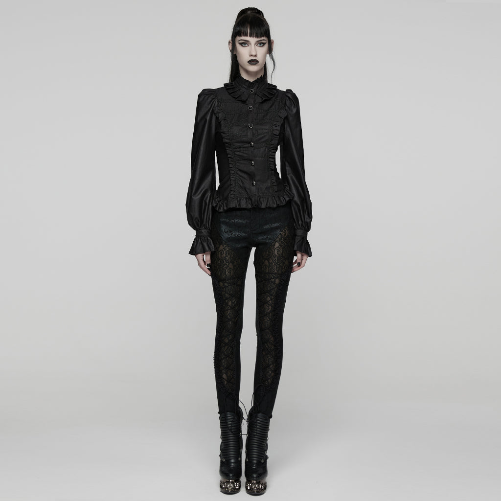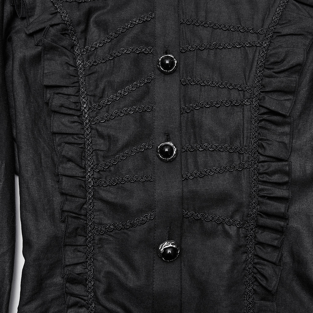 Introducing the Gothic Shirts Victorian Ruffled Button-Up Blouse with High Collar, a timeless piece that merges Victorian elegance with a bold gothic twist. This blouse is ideal for those who crave a sophisticated yet edgy look, boasting intricate ruffles and a striking high collar that amplifies any outfit. Perfect for making a stylish statement, this shirt is your ultimate choice for a classic gothic ensemble.