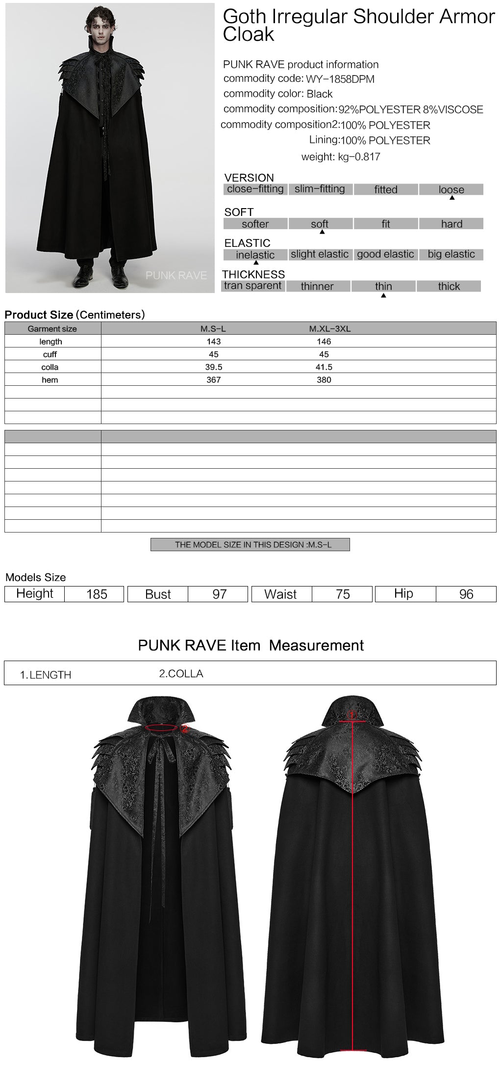 Fit and Feel: Designed with a loose fit, this cape drapes elegantly over the body, adding an air of mystery and power. The combination of fabrics offers a luxurious feel, complemented by the sophisticated design that embodies gothic innovation.