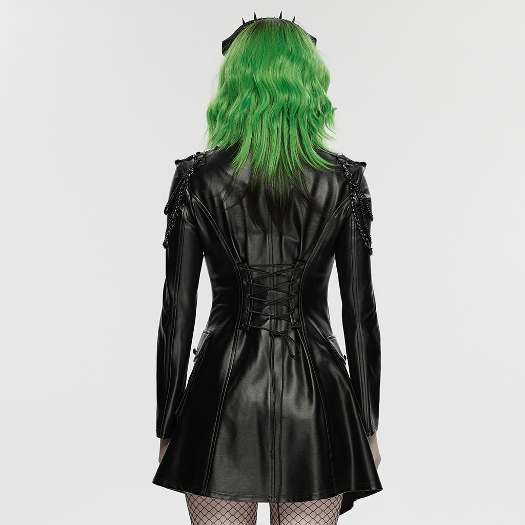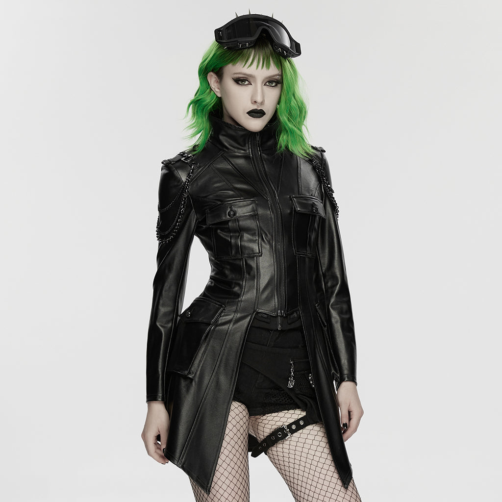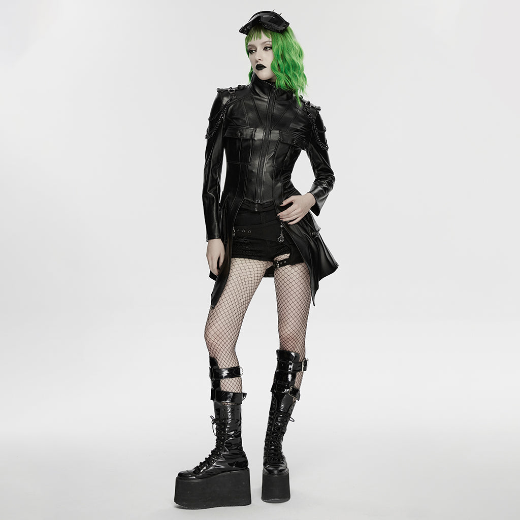 Introducing the Edgy Longline Faux Leather Punk Jacket with Chain Details, a bold statement in the world of punk jackets. This piece merges traditional punk rebellion with modern design sophistication. With its striking chain accents and sleek silhouette, this jacket is a must-have for anyone looking to push boundaries and turn heads. Step out in style and let your outfit do the talking.